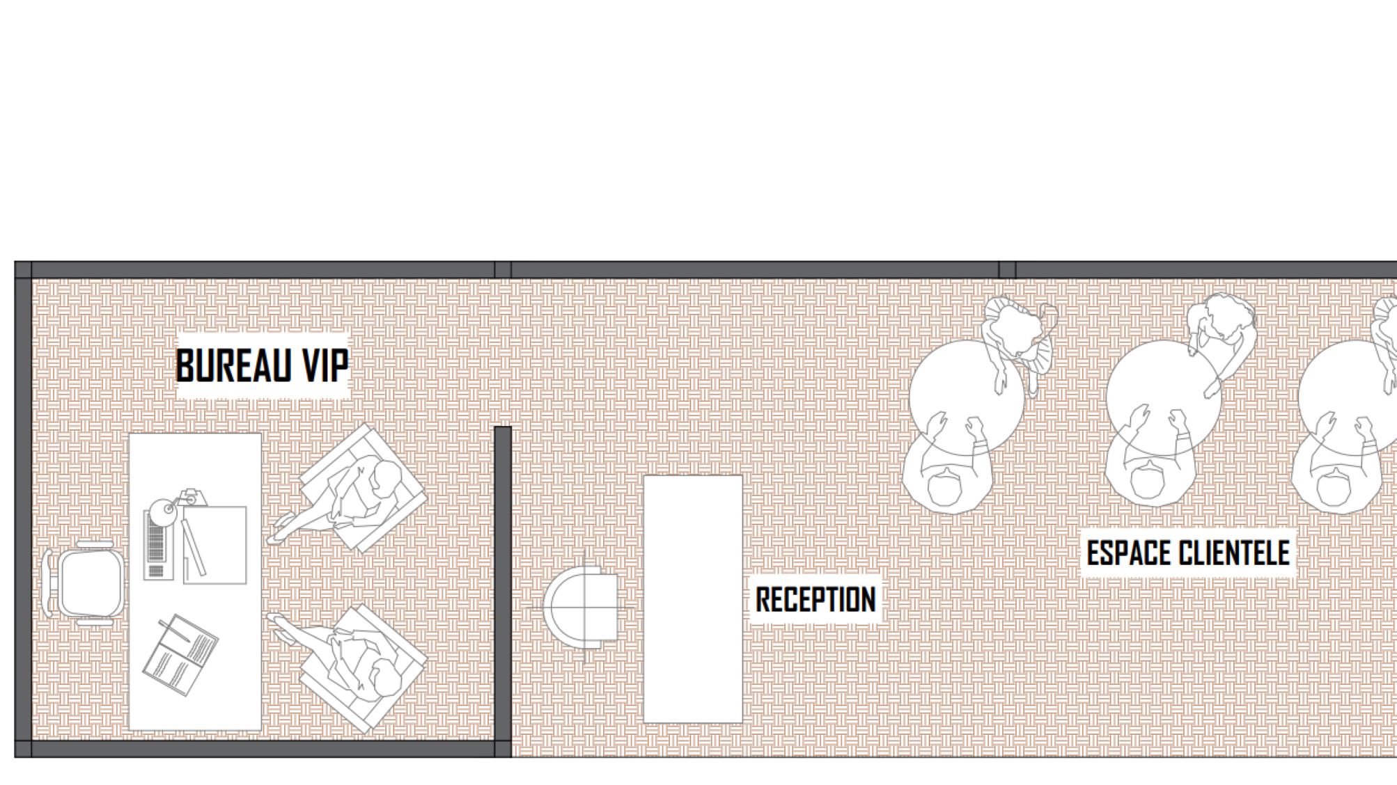 bureau, une réception et un espace clientèle.